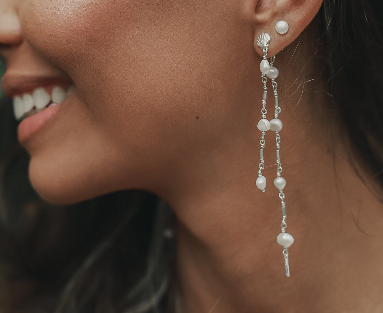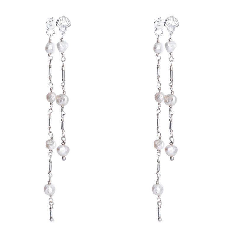 - Descrição: Brinco em prata 925 com pérolas de água doce e detalhes de concha.