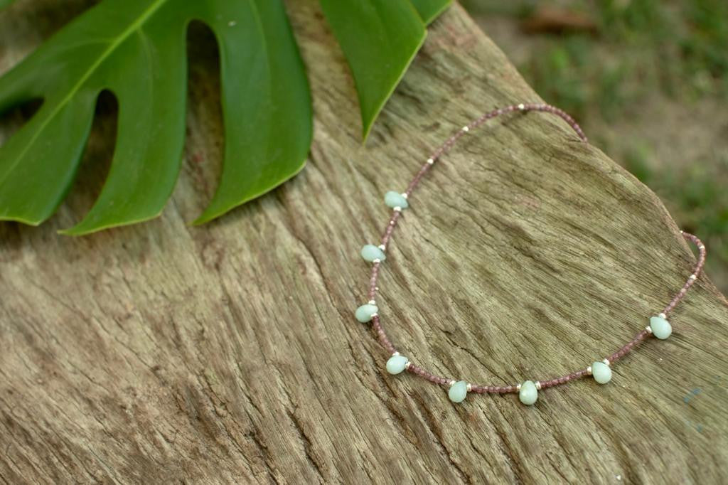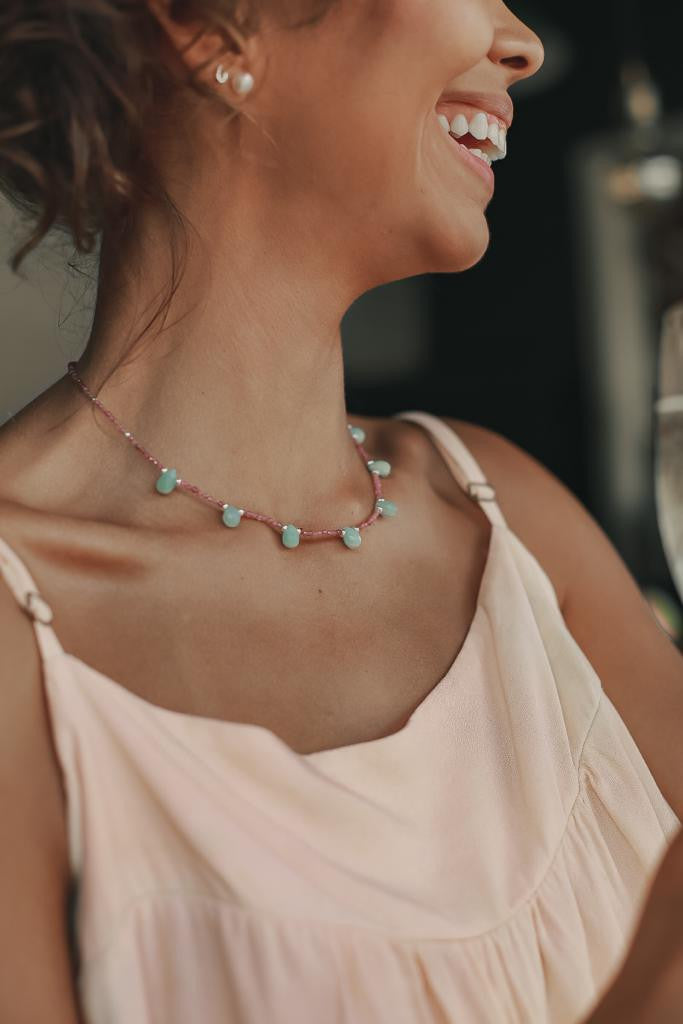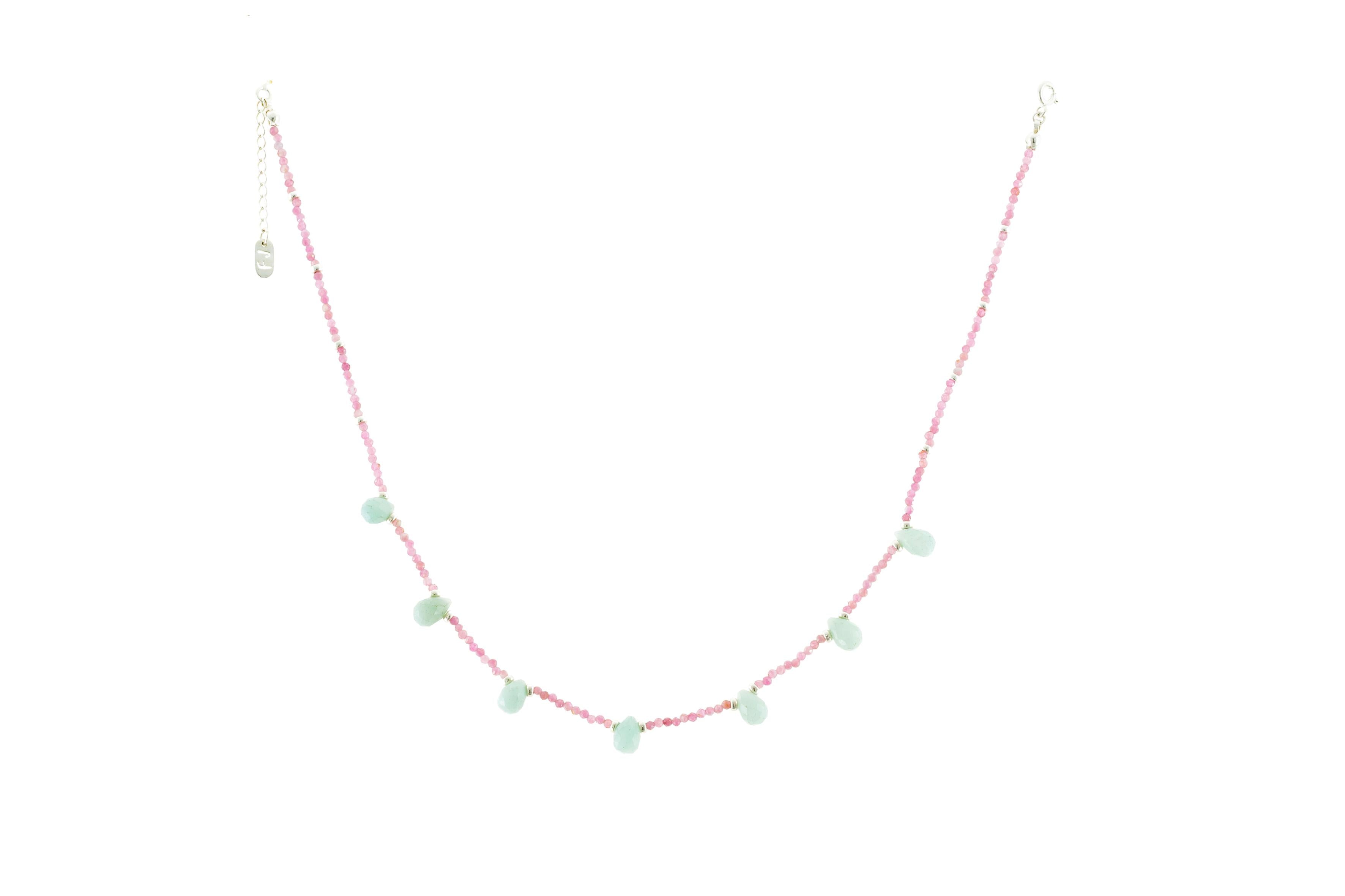 - Descrição: Colar de pedras Amazonita e Rubelita, acabamento em prata 925.
