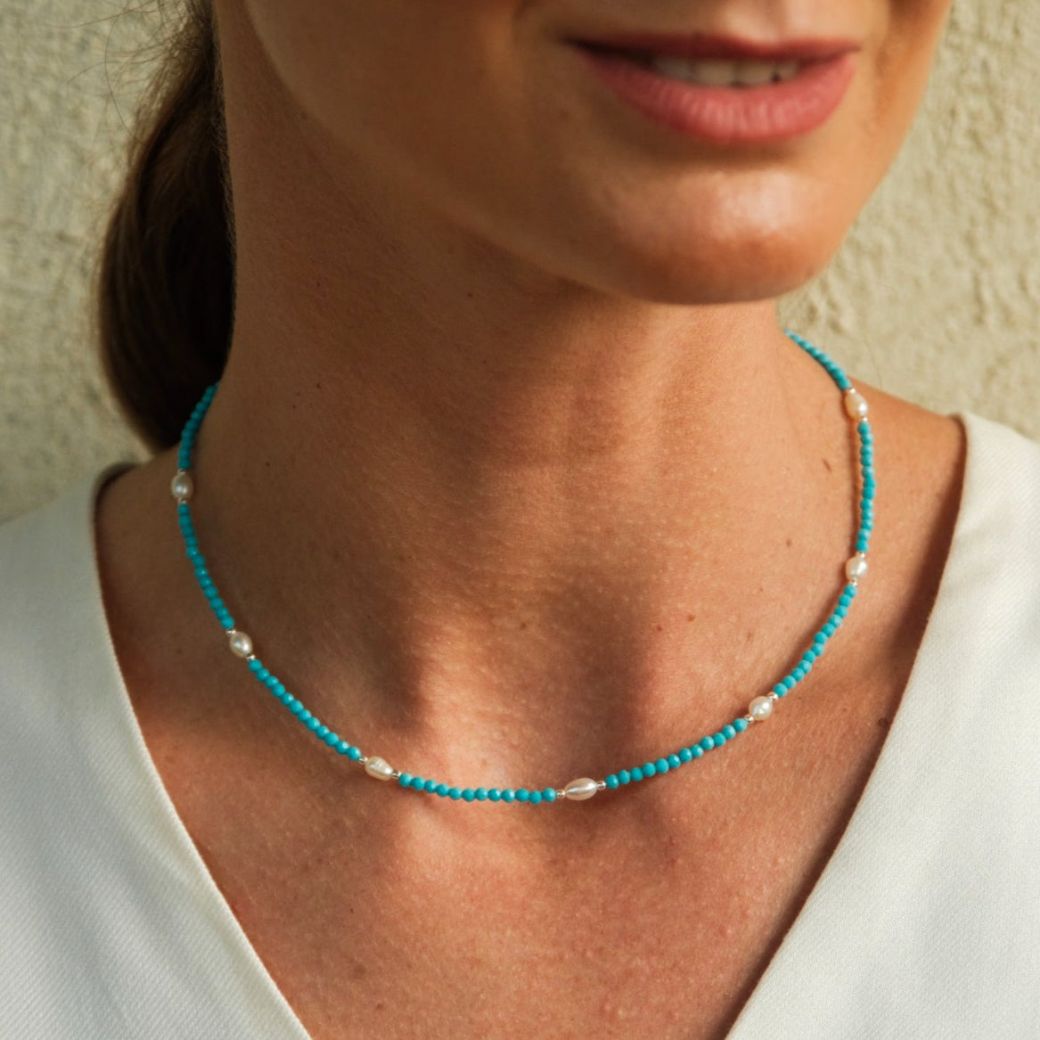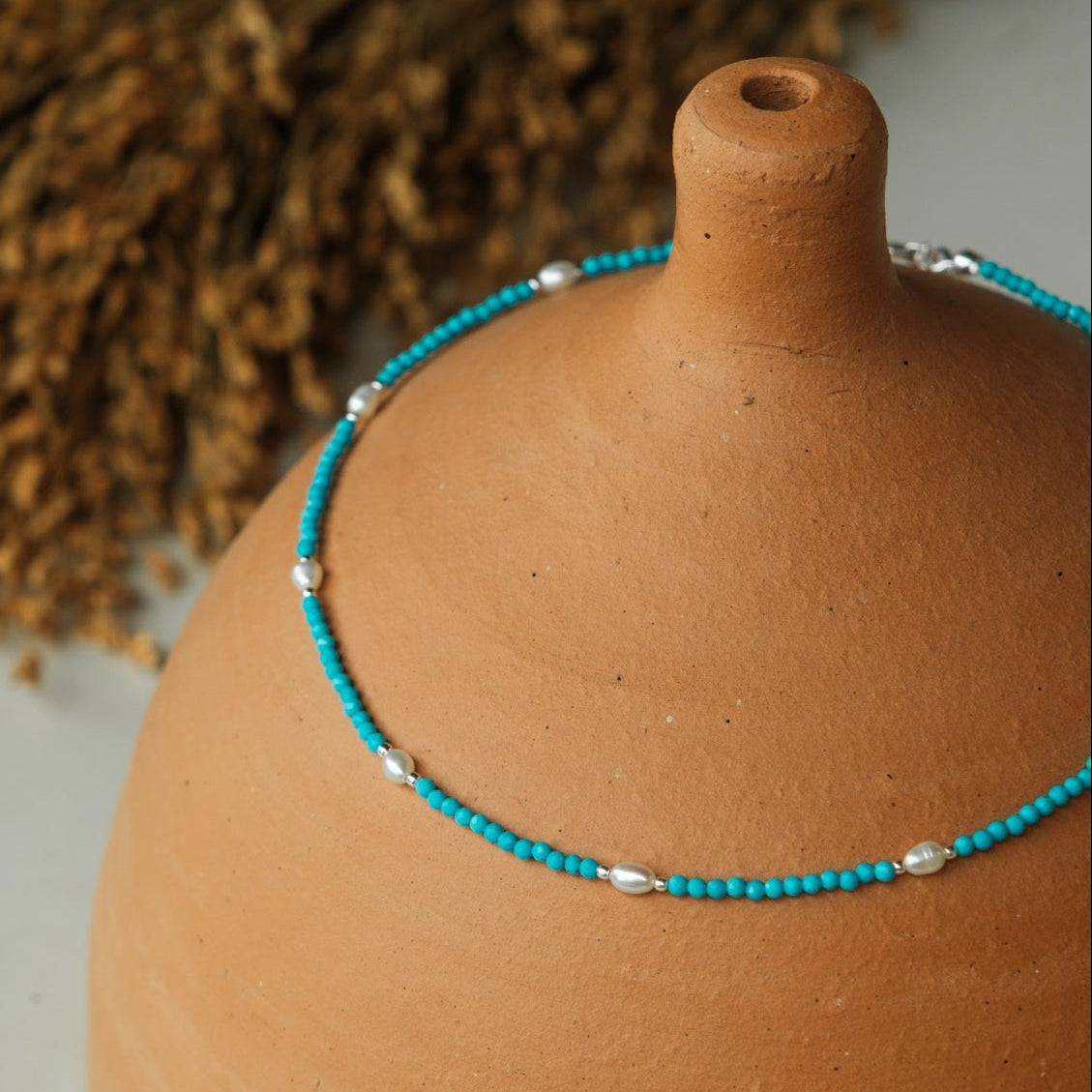 • Descrição: Colar de pedras turquesa esféricas, intercaladas com pérolas de água doce entre esferas de prata 925.