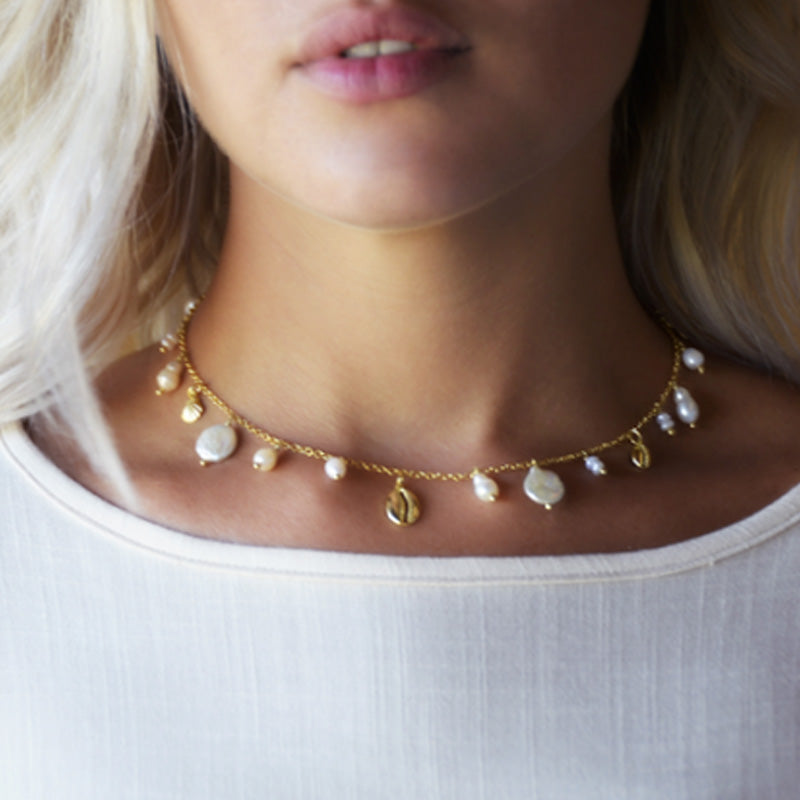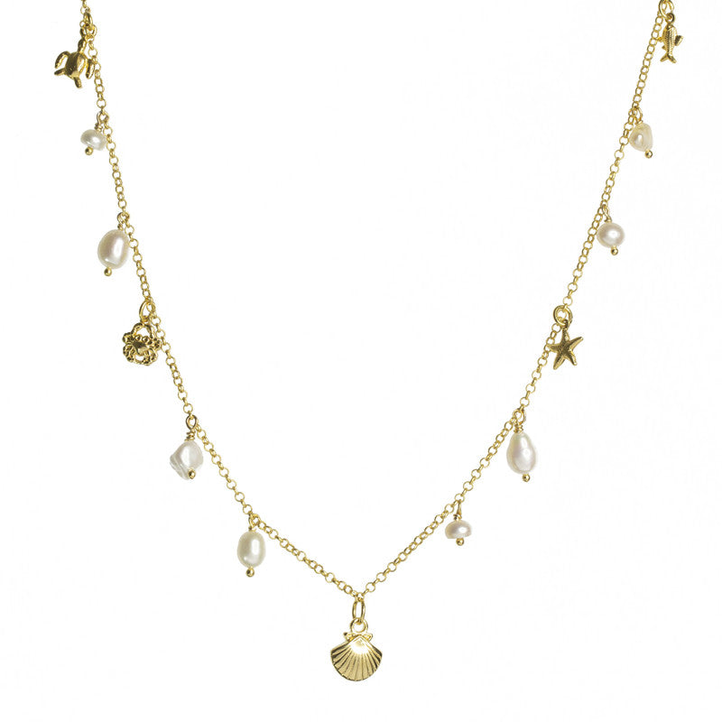• Descrição: Colar de prata 925 banhada a ouro 18K, com detalhes em pérolas.
