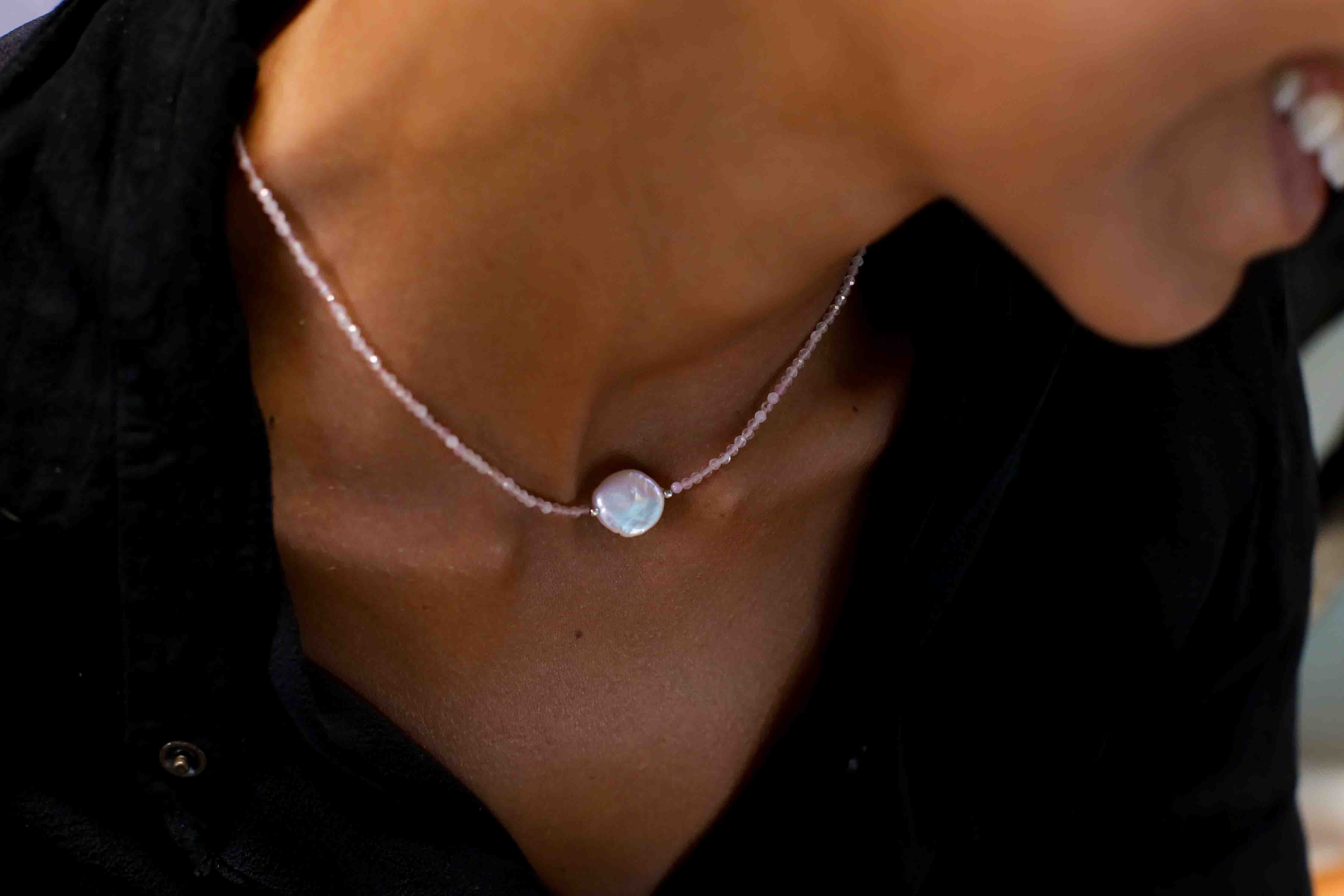 - Descrição: Colar de pedras quartzo rosa com pérolas de água doce, acabamento em prata 925.