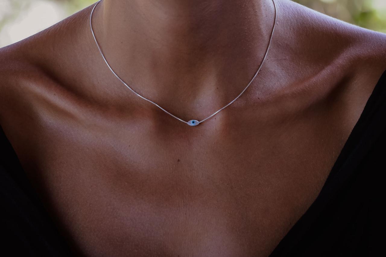 • Descrição: Colar em prata 925 com um pingente de madrepérola em formato de olho grego.