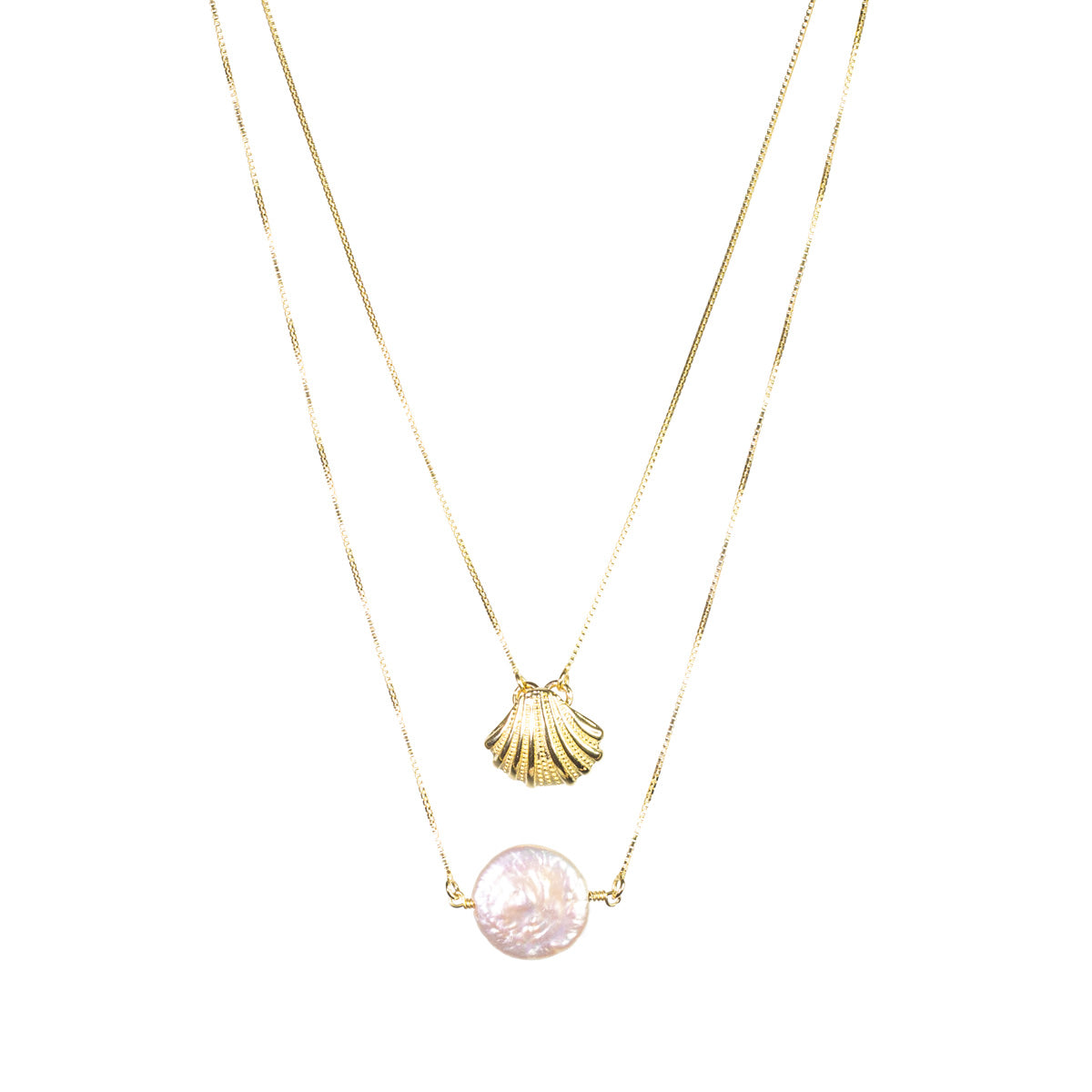 - Descrição: Escapulário de prata dourada, um pingente de concha em prata dourada e um de pérola.
