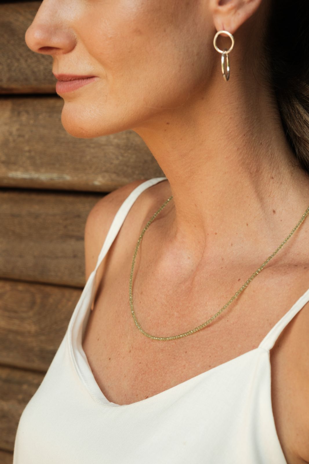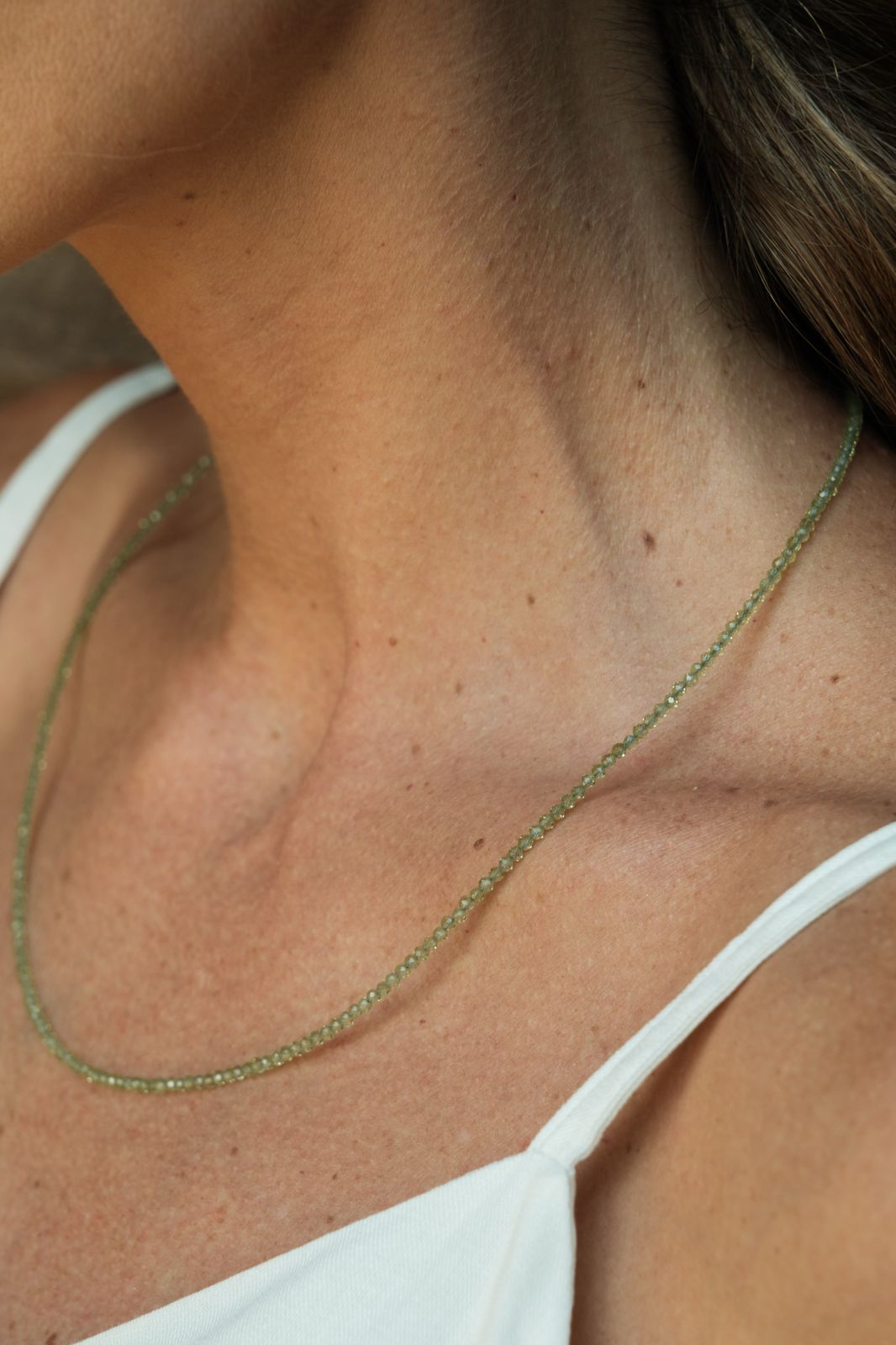 - Descrição: : Pedras Peridoto 2 mm, fio de aço encapado com fecho em prata 925.