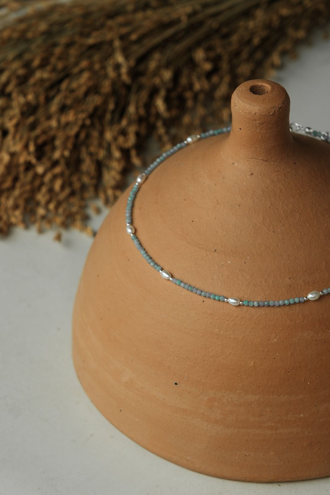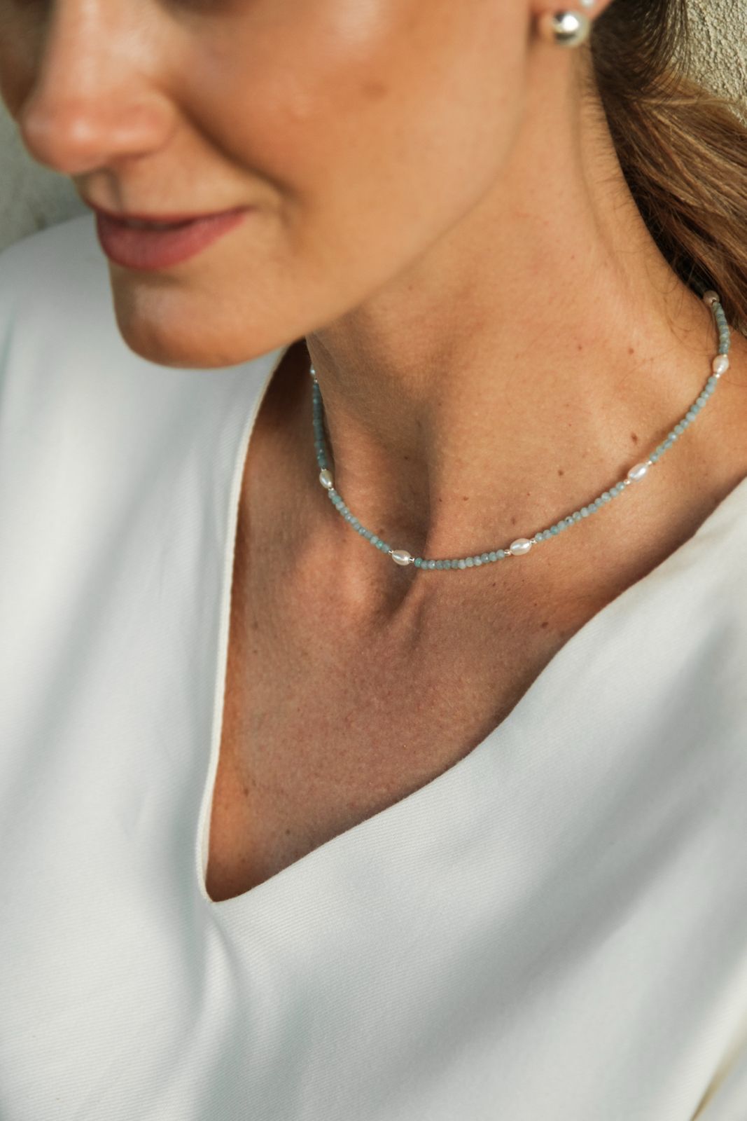 - Descrição: Colar de pedras amazonita esféricas, intercalado com pérolas de água doce entre esferas de prata 925.