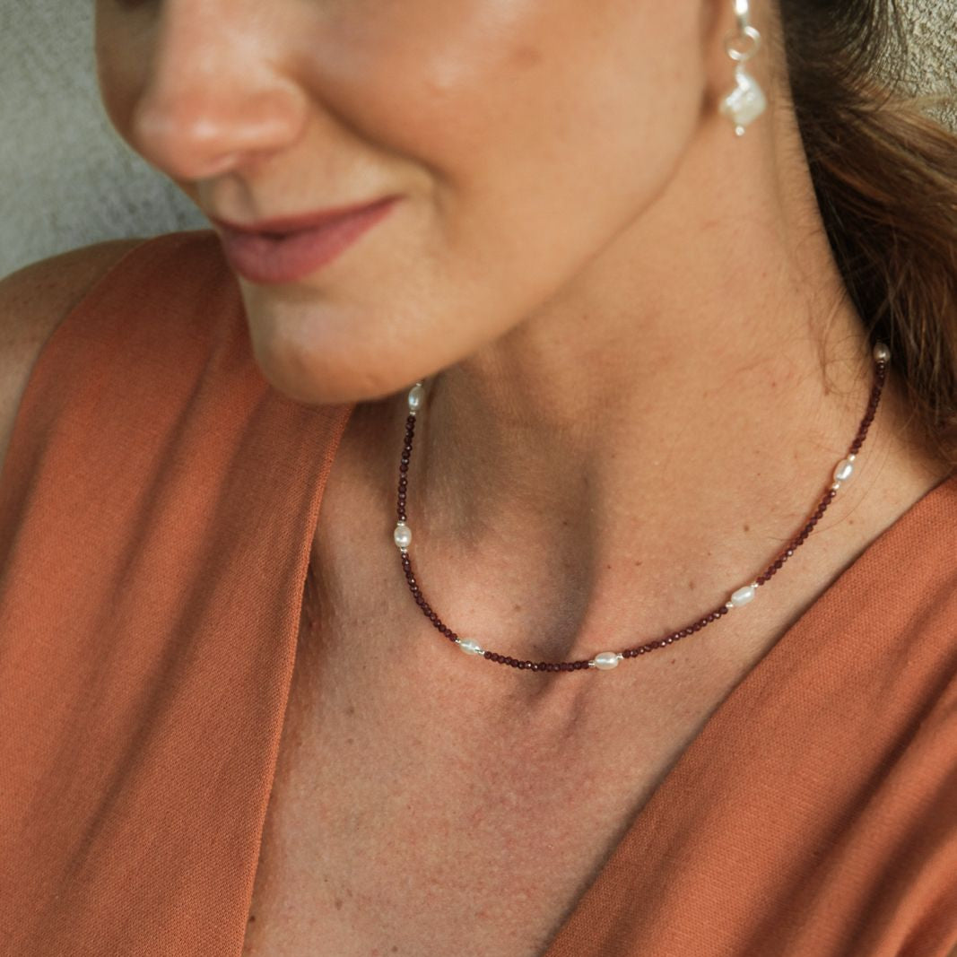 - Descrição: Colar de pedras Granada esféricas, intercalado com pérolas de água doce entre esferas de prata 925.