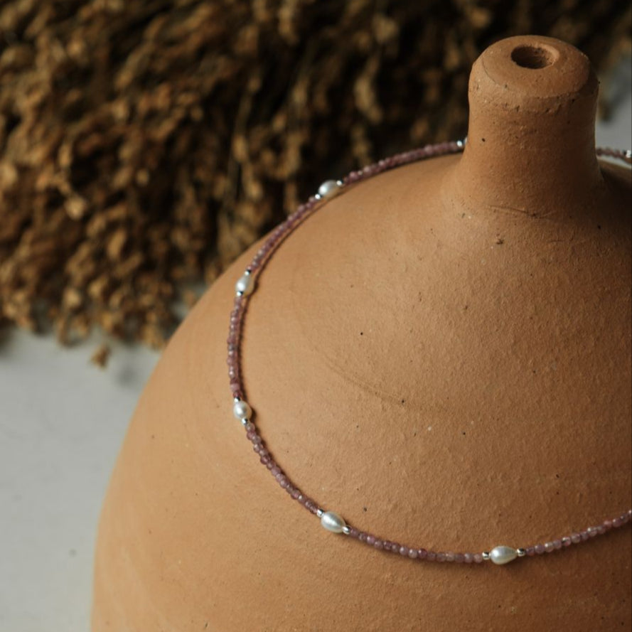 - Descrição: Colar de pedras rubelita esféricas, intercalado com pérolas de água doce entre esferas de prata 925.
