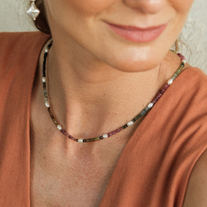 - Descrição: Pedras turmalina em forma rondel 3 mm, pérolas arroz de água doce, fio de aço encapado com acabamento em prata 925.