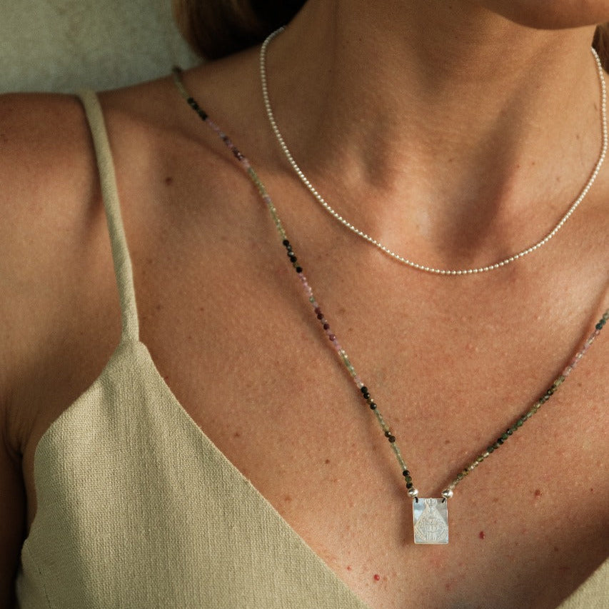 • Descrição: Colar escapulário de pedras naturais turmalina com pingente de Nossa Senhora (Em Madrepérola), acabamento em prata 925.