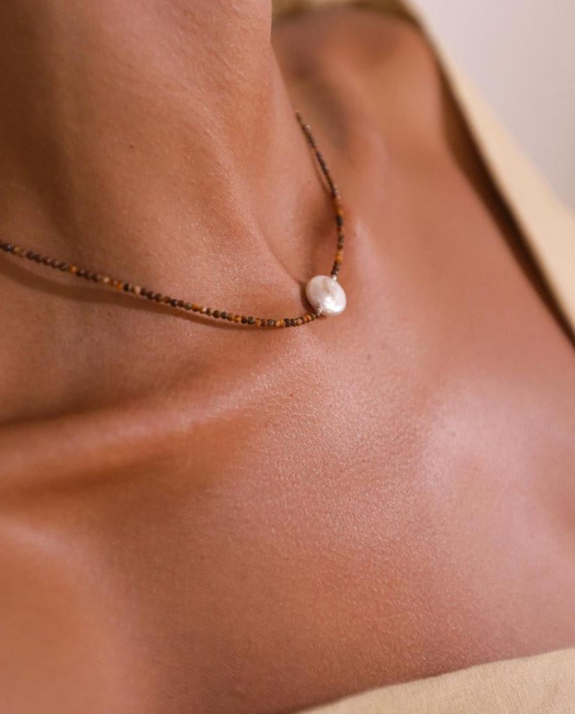 - Descrição: Colar de pedras olho de tigre com pérolas de água doce, acabamento em prata 925.