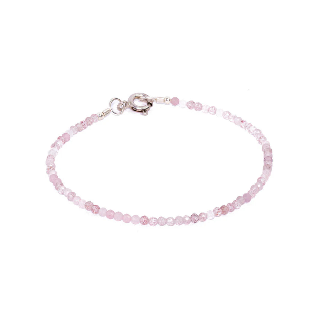 - Descrição: Pulseira de pedras quartzo rosa com acabamento de prata 925.