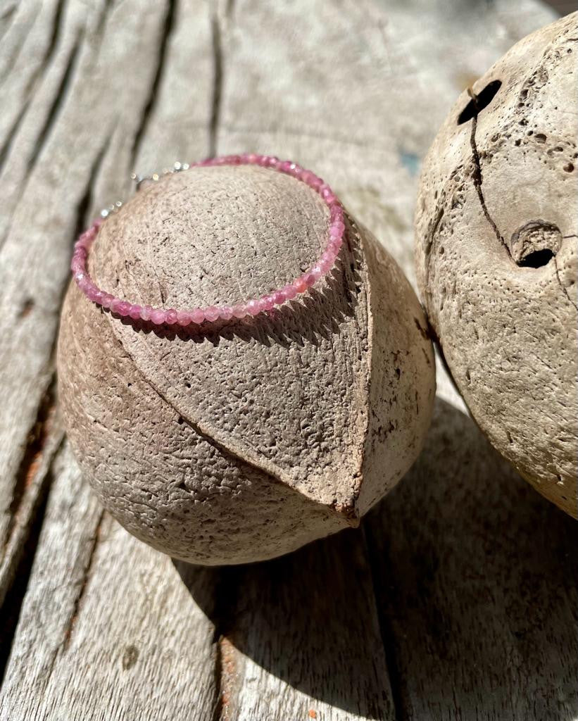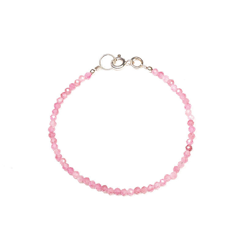 - Descrição: Pulseira de pedras rubelita com acabamento de prata 925.